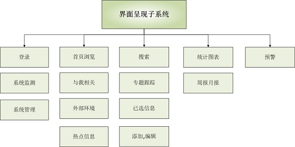 界面呈現子系統讓各個數據來源的最新信息分門別類實時呈現在用戶的桌面瀏覽器中。其功能架構如下。