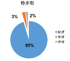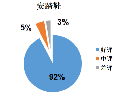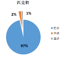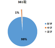 通過對比安踏、李寧、特步、361、百麗、匹克這6種鞋子的三種評價,得出結論:361這款鞋子的好評量是最多的,中評量和差評量也是最少的;最少的好評量是百麗這款鞋子,它的差評量也是最高的,高達4%,有可能是因為百麗的評論樣本量不是足夠大,導致數據有差異性。