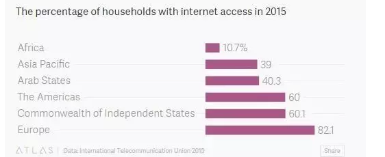 與世界上一些地區(qū)有大量的Wi-Fi網(wǎng)絡(luò)形成鮮明對比的是,非洲在這方面明顯滯后。到2015年,非洲10個家庭中,只有1個家庭擁有互聯(lián)網(wǎng),而歐洲國家的比例達到80%以上。與此同時,根據(jù)聯(lián)合國全球互聯(lián)網(wǎng)連接報告預計,到了2015年,幾乎有一半的世界人口將可以直接連接互聯(lián)網(wǎng),而在最不發(fā)達國家中,這一數(shù)字降到了不到10%。