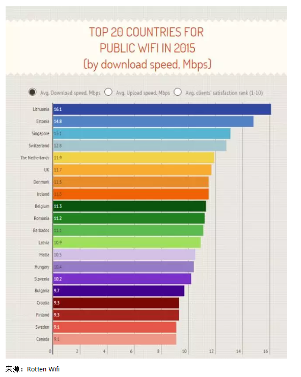 但連接的質(zhì)量確實變好了。公共網(wǎng)絡(luò)公司Rotten?Wi-Fi調(diào)查了184個國家的網(wǎng)絡(luò)狀況,最后選出了Wi-Fi公共網(wǎng)絡(luò)服務最好的國家。根據(jù)用戶的經(jīng)驗,其對每個國家對公共熱點的測試均從速度和質(zhì)量兩方面展開。