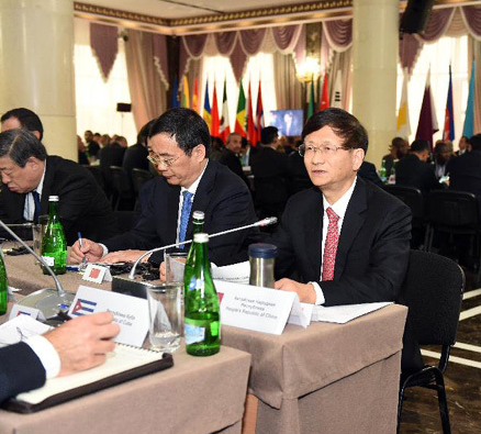 5月24日,在俄羅斯車臣共和國首府格羅茲尼,中共中央政治局委員、中央政法委書記孟建柱(前右一)在第七屆安全事務高級代表國際會議上發言。中共中央政治局委員、中央政法委書記孟建柱24日在俄羅斯車臣出席第七屆安全事務高級代表國際會議。來自70余個國家和國際組織的代表就深化國際安全合作、有效應對恐怖主義等問題進行探討。