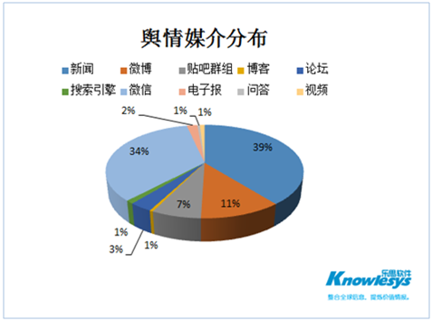 根據(jù)樂思網(wǎng)絡(luò)輿情監(jiān)測系統(tǒng)數(shù)據(jù),從媒介分布來看,新聞和微信公眾平臺成為事件報(bào)道的主力,分別占39%,34%。事件發(fā)生后,吉大學(xué)生在微博上報(bào)料,引起很大的關(guān)注,網(wǎng)友紛紛評論轉(zhuǎn)發(fā),因此微博以11%的占比名列第三。