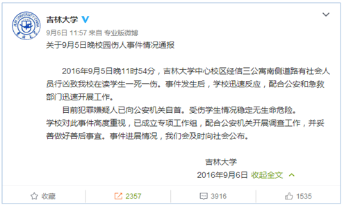 ?9月5日晚11時(shí)54分,吉林大學(xué)中心校區(qū)經(jīng)信三公寓南側(cè)道路有社會人員行兇,在讀學(xué)生一死一傷。事件發(fā)生后,校方迅速反應(yīng),配合公安和急救部門迅速開展工作。目前犯罪嫌疑人已向公安機(jī)關(guān)投案自首。受傷學(xué)生情況穩(wěn)定無生命危險(xiǎn)。校方表示:就目前掌握的情況看,行兇者并不是吉大學(xué)生,而是社會人員,雙方好像也沒有什么交集,應(yīng)該并不認(rèn)識,但這還有待公安機(jī)關(guān)確認(rèn)。
