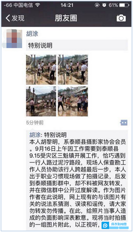 受強(qiáng)臺(tái)風(fēng)影響,浙江省溫州市泰順縣近日遭遇強(qiáng)降雨、受災(zāi)嚴(yán)重。在該縣動(dòng)員救災(zāi)期間,一張?zhí)╉樋h教育局計(jì)財(cái)科科長(zhǎng)包序威靠他人攙扶過淤泥的圖片引發(fā)網(wǎng)友熱議。事件發(fā)生后,泰順縣教育局9月16日下午通報(bào),涉事人現(xiàn)已免職接受調(diào)查。而包序威表示:并沒像網(wǎng)上傳的那樣讓人抬著去了解災(zāi)情,只是在別人幫助下過了一處淤泥。與此同時(shí),拍照者胡黎明則在朋友圈發(fā)辟謠申明并致歉。