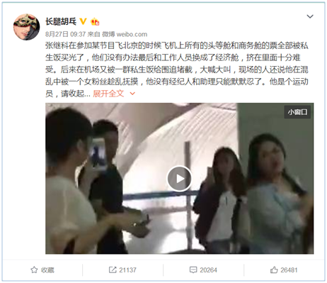 (認證為“娛樂評論人”的網民“長腿胡乓”的一條微博,轉發21,137次,評論20,264條,點贊26,481個,讓倒賣明星航班信息的產業鏈浮出水面。)