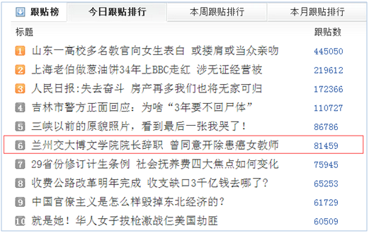 從網易今日跟帖排行榜中可以看到,該條新聞排在榜單的第六位,跟帖量達到81,459條。在“劉伶俐事件”曝光以后,輿論紛紛譴責陳玲的行為,揭露其學歷造假,曝光學院對待教師的不公問題。然而,校方這種以陳玲自愿辭去院長職務來了結該事件的行為,輿論顯然“不買賬”。