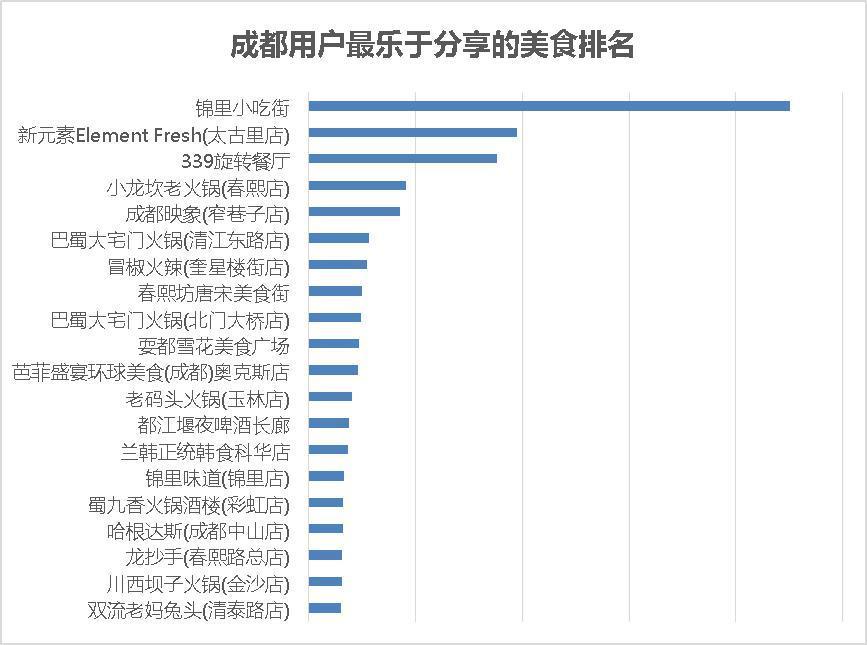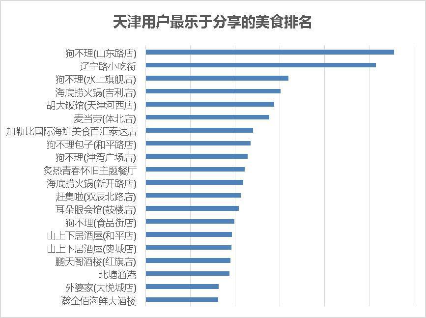 借助騰訊大數據,提取2016年1-8月,用戶通過社交(包括微信朋友圈簽到、QQzone等)分享的位置興趣點信息,對北上廣深4個城市餐飲分享的TOP20排名。