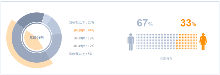 從關注人群的年齡分布比例可以看出,20-29歲人群的關注度最高,占比44%,19歲以下和30-39歲年齡段位列二三位,二者占比相當接近,分別為20%,19%。從數(shù)據(jù)可以看出,80后和90后對此次關注度最高,他們也是出行的主力人群。從年齡分布來看,男性較男性的關注度高。