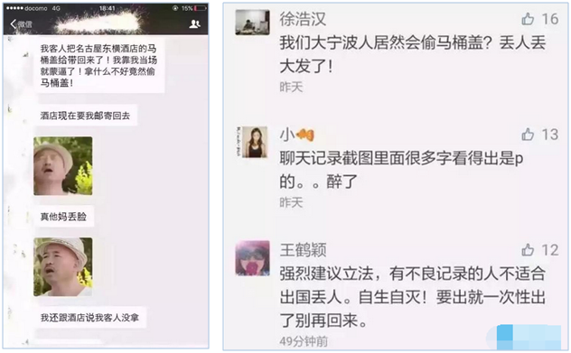 @作家崔成浩:一對中國夫婦,去日本旅游,竟偷走酒店的馬桶蓋。盡管事后道歉,寄回馬桶蓋,可中國人的臉算是讓你丟盡了。據說這對夫婦是某地銀行職員,收入也不低,可這么下三濫的事兒也干得出,只能說是素質問題了。奉勸某些人,在外做不道德事兒前好好想一想,就算你不要臉,也不應讓全體同胞跟你一起丟臉。