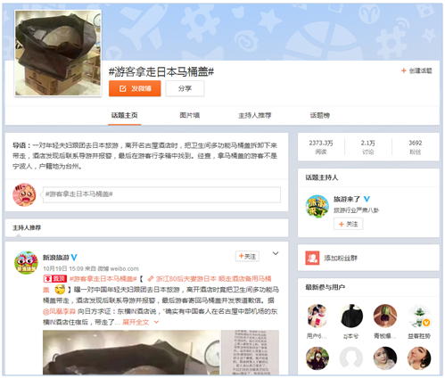 根據新浪微博微話題數據,“游客拿走日本馬桶蓋”排在今日微話題榜單的第十四位,該話題的閱讀量達到2371.4萬,討論人數為2.1萬,該話題的直接關注粉絲為3697人。