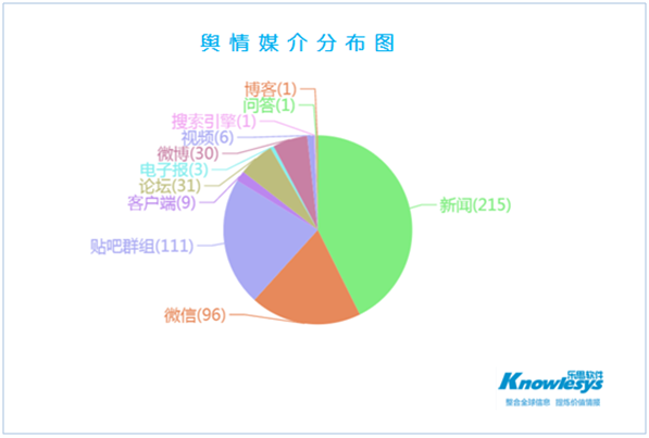根據樂思網絡輿情監測系統的實時數據,新聞媒體,貼吧群組,微信公眾號排在輿情關注度的前三位,其中新聞媒體以215條信息量,占比42.66%名列第一,貼吧群組以111條信息量,占比22.02%排在第二,微信公眾平臺以96條信息量,占比19.05%位列第三。三者占據輿情媒介總量的83.73%。