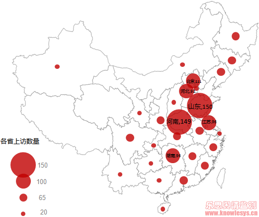 從天涯上曝光的信訪輿情事件來源點分布看,山東省、河南省作為人口大省成為天涯上訪的重災區,北京市、江蘇省、湖南省、河北省、黑龍江省、浙江省、廣東省、湖北省等網友在天涯論壇上頻繁上訪。從信訪事件分布圖來看,信訪輿情高發區一般都是經濟發達的東部或者是處在快速發展的中部地區,一方面,這些地區受到經濟發展的需要影響,土地征用事件發生概率大大增大,這就涉及到很多利益糾紛,一旦處理不當就容易引發民眾上訪。另一方面,受到當地民眾的文化程度、社會文明程度和法制觀念影響,民眾的維權意識越來越強,這也是導致司法檢舉類和申訴信訪辦類信訪事件增多的一個重要因素。因此,作為信訪輿情事件頻發的集中區,當地政府或相關部門應做好輿情預警,熟悉信訪輿情應對和處置業務的準備,及時發現問題,正面引導,快速處置,把輿情危機扼殺在萌芽狀態。(注:圓半徑=各省的上訪事件總量/圓周率)