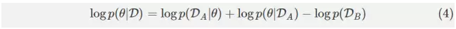 看看(3)右邊的中間三個項。它們看起來很熟悉嗎?它們應該。這三個項是方程(2)的右邊,但是 D 被 DA 代替了。簡單來說,這三個項等價于給定任務 A 數據的網絡參數的條件概率的對數。這樣,我們得到了下面這個方程: