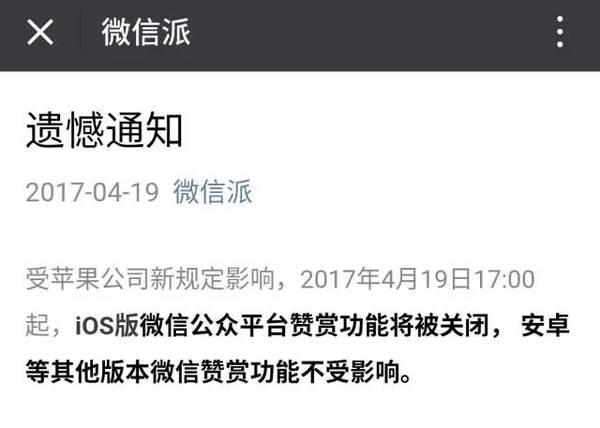 2017年4月19日,微信公號“微信派”發出《遺憾通知》,2017年4月19日17:00起,iOS版微信公眾平臺贊賞功能將被關閉, 安卓等其他版本微信贊賞功能不受影響。并緊急上線變形的贊賞放肆,“iOS 版微信用戶可以通過二維碼轉賬方式,支持喜愛的微信公眾號運營者。”20日,又《再次通知》,因“蘋果公司要求,App 不得包含指引客戶使用非 IAP 機制進行購買的按鈕、外部鏈接或其他行動號召用語”,“因此,我們緊急對昨天下午上線的iOS版微信公眾平臺文章個人轉賬功能進行關閉。”