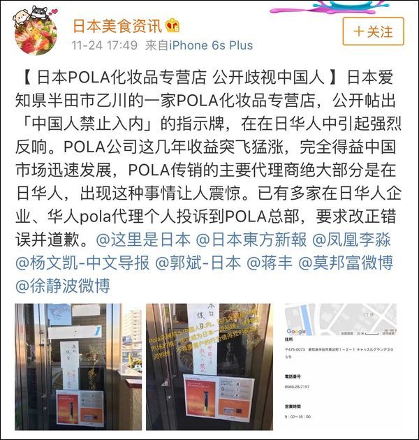 近日,微博博主@日本美食資訊 發博稱,一家位于日本愛知縣半田市乙川的POLA化妝品專營店,公開貼出“中國人禁止入內”的告示,此舉在在日華人間引起強烈反響。