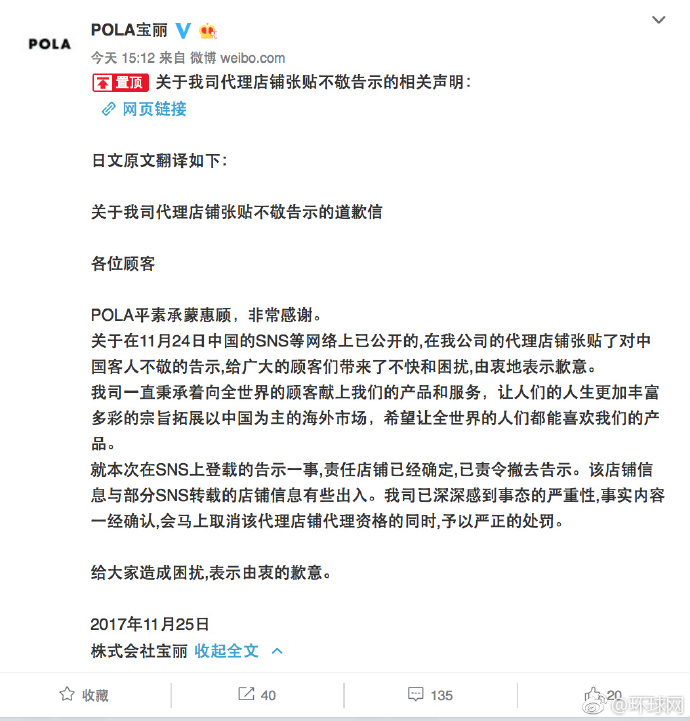 寶麗公司25日在官網上貼出中文及日文版本的道歉信表示:“在我公司的代理店鋪張貼了對客人不敬的表述,給廣大的顧客們帶來了不快和困擾,由衷地表示歉意。”
