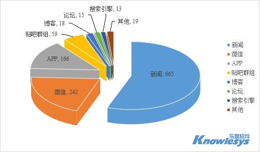 樂思軟件輿情監測數據顯示,截至目前此次輿情監測媒體構成類型中,排在采集來源榜前三位的是新聞、微信和APP。新聞是重要的信息傳播平臺,數據量達到665條,微信和APP分別為242和166條。