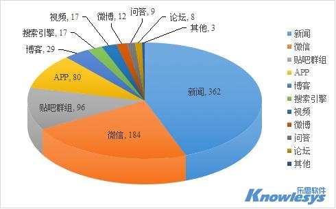 樂思軟件輿情監(jiān)測數(shù)據(jù)顯示,截至目前此次輿情監(jiān)測媒體構(gòu)成類型中,排在采集來源榜前三位的是新聞、微信和貼吧群組。新聞是重要的信息傳播平臺,數(shù)據(jù)量達(dá)到362條,微信和貼吧群組分別為184和96條。