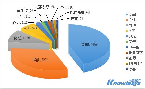 樂思軟件輿情監(jiān)測(cè)數(shù)據(jù)顯示,截至目前此次輿情監(jiān)測(cè)媒體構(gòu)成類型中,排在采集來源榜前三位的是新聞、微信和微博。新聞是重要的信息傳播平臺(tái),數(shù)據(jù)量達(dá)到4469條,微信和微博分別為3274和1036條。
