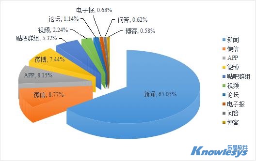 樂思軟件輿情監(jiān)測數(shù)據(jù)顯示,截至目前此次輿情監(jiān)測媒體構(gòu)成類型中,排在采集來源榜前三位的是新聞、微信和APP。新聞是重要的信息傳播平臺,數(shù)據(jù)占比為65.05%,微信和APP分別占8.77%和8.15%。