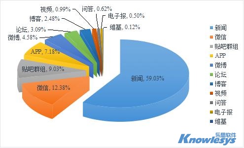 樂思軟件輿情監測數據顯示,截至目前此次輿情監測媒體構成類型中,排在采集來源榜前三位的是新聞、微信和貼吧群組。新聞是重要的信息傳播平臺,數據占比為59.03%,微信和貼吧群組分別占12.38%和9.03%。