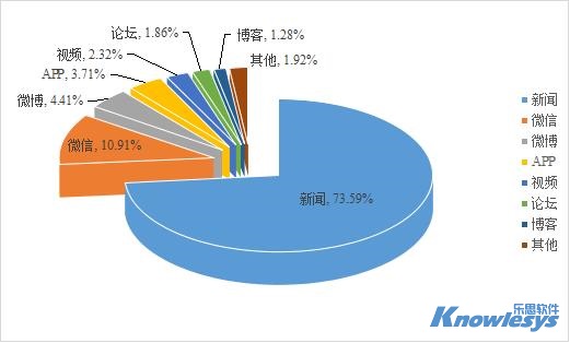 樂思軟件輿情監測數據顯示,截至目前此次輿情監測媒體構成類型中,排在采集來源榜前三位的是新聞、微信和微博。新聞是重要的信息傳播平臺,數據占比為73.59%,微信和微博分別占10.91%和4.41%。