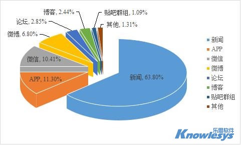 樂思軟件輿情監測數據顯示,截至目前此次輿情監測媒體構成類型中,排在采集來源榜前三位的是新聞、APP和微信。新聞是重要的信息傳播平臺,數據占比為63.80%,APP和微信分別占11.30%和10.41%。