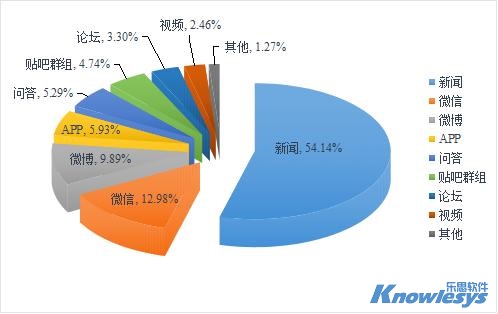樂思軟件輿情監測數據顯示,截至目前此次輿情監測媒體構成類型中,排在采集來源榜前三位的是新聞、微信和微博。新聞是重要的信息傳播平臺,數據占比為54.14%,微信和微博分別占12.98%和9.89%。