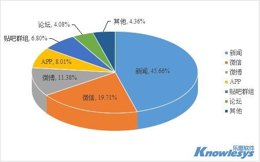 樂(lè)思軟件輿情監(jiān)測(cè)數(shù)據(jù)顯示,截至目前此次輿情監(jiān)測(cè)媒體構(gòu)成類型中,排在采集來(lái)源榜前三位的是新聞、微信和微博。新聞是重要的信息傳播平臺(tái),數(shù)據(jù)占比為45.66%,微信和微博分別占19.71%和11.38%。