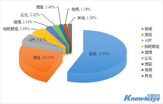 樂思軟件輿情監測數據顯示,截至目前此次輿情監測媒體構成類型中,排在采集來源榜前三位的是新聞、微信和APP。新聞是重要的信息傳播平臺,數據占比為55.93%,微信和APP分別占24.51%和5.87%。