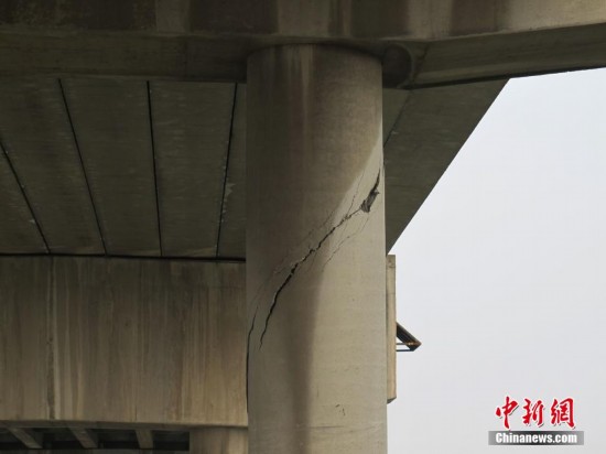 3月10日,上海市松江區松蒸公路斜塘大橋遭到船只撞擊,發生橋墩開裂及坍塌隱患。目前相關部門已在大橋兩端采取緊急封路措施。據悉,肇事船只已逃逸,相關部門仍在追查過程中。圖為開裂的橋墩。