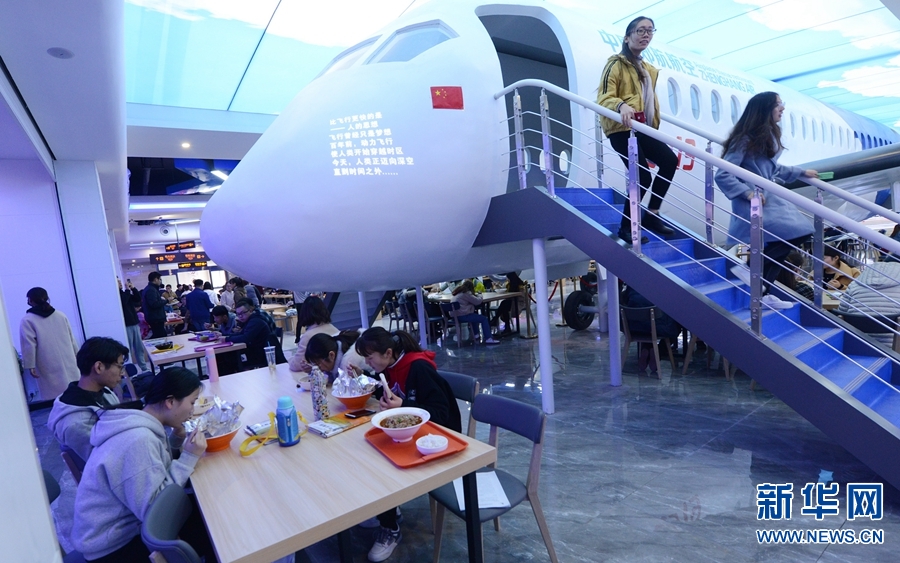 11月28日報道,鄭州,近日,鄭州航空工業(yè)管理學(xué)院打造了一個航空主題餐廳,一架國產(chǎn)C919飛機模型亮相東苑餐廳三樓,售飯窗口“變身”值機柜臺,“國內(nèi)航班候機區(qū)”導(dǎo)視牌,以及星空頂燈,餐廳的各個細節(jié)都給人一種登機的真實感,吸引了許多學(xué)生前來參觀體驗、就餐。
