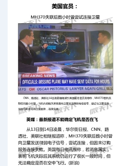 CNN報道,美官員13日說,美方已開始在印度洋搜索失聯馬航客機。報道稱,美官員與馬來西亞進行了信息共享,根據所掌握的信息,相信飛機飛到了印度洋。海軍第七艦隊指揮官威廉·馬克說,應馬來西亞政府請求,美海軍“基德”導彈驅逐艦正開往印度洋。