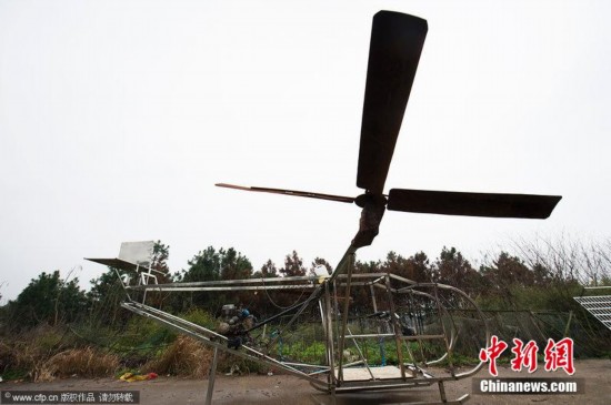 2014年3月12日,湖南岳陽,只有初中文化水平、從來沒見過真正飛機的農民李厚勝和自己用摩托車發動機改造制成的“魚鷹直升機”,李厚勝為其取名“馬上飛”。