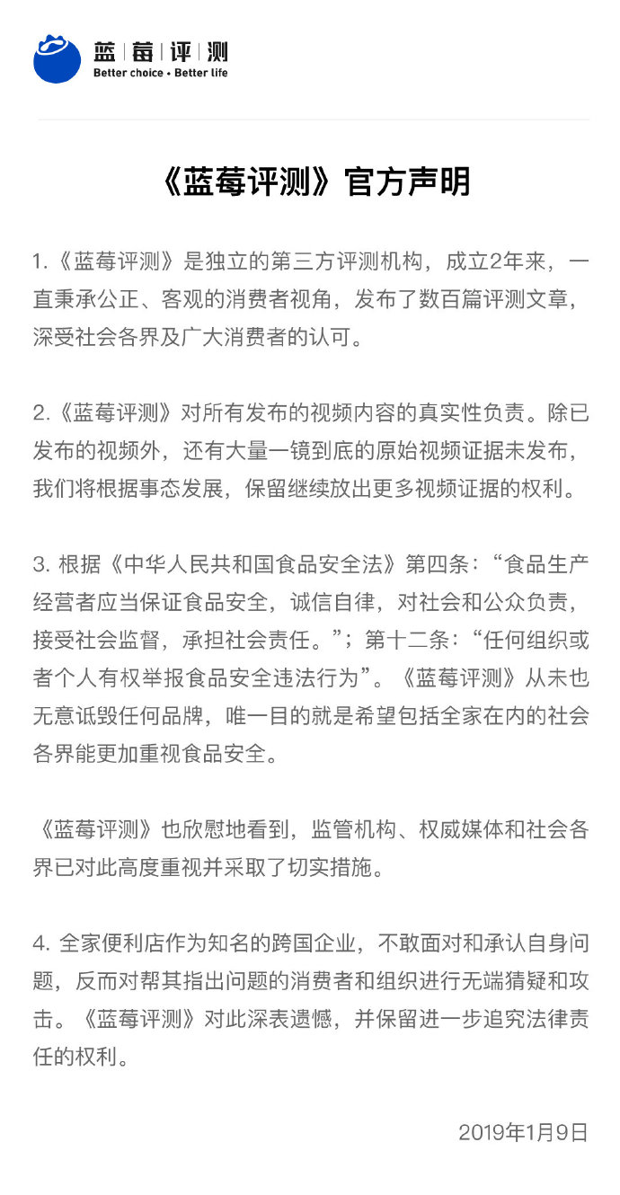 1月9日,@藍(lán)莓評測 發(fā)布官方聲明,稱對視頻內(nèi)容真實(shí)性負(fù)責(zé),保留大量原始視頻未發(fā)布。對于全家便利店不敢面對和承認(rèn)自身問題,深表遺憾,并保留進(jìn)一步追究法律責(zé)任的權(quán)利。