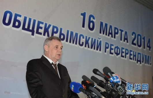 3月16日,在烏克蘭克里米亞辛菲羅波爾市,2014年烏克蘭克里米亞自治共和國全民公投籌備與執行委員會主席米哈伊爾·馬雷舍夫宣布最終投票率。 馬雷舍夫16日在計票過半數后宣布,公投最終投票率為82.71%;贊成加入俄羅斯的選票占95.5%。