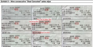 報告列舉了某個門店9張連號的交易小票,竟然全部都顯示“取消交易”。