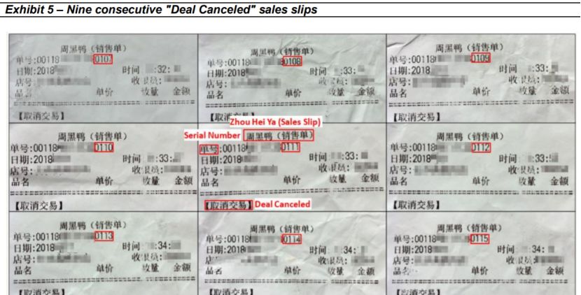 該報告估算認為,周黑鴨在華中地區(qū)的銷量被高估了38.7%。其中在湖南和江西兩省,很多門店存在大量虛報交易的行為,具體表現(xiàn)為收銀員在POS機上輸入大量交易后立刻取消。
