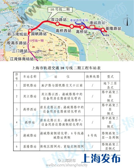 10號線二期全長10.08公里,建成后將為浦東新區與市中心、與虹橋樞紐的聯系開辟一條新的快捷路線。二期項目設國帆路、雙江路、高橋西、高橋、港城路(可換乘6號線)、基隆路六個站。其中,國帆路站為地下三層島式車站,其余車站均為高架二層或三層車站。線路將采用A型車6節編組。