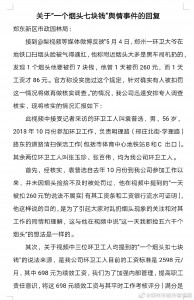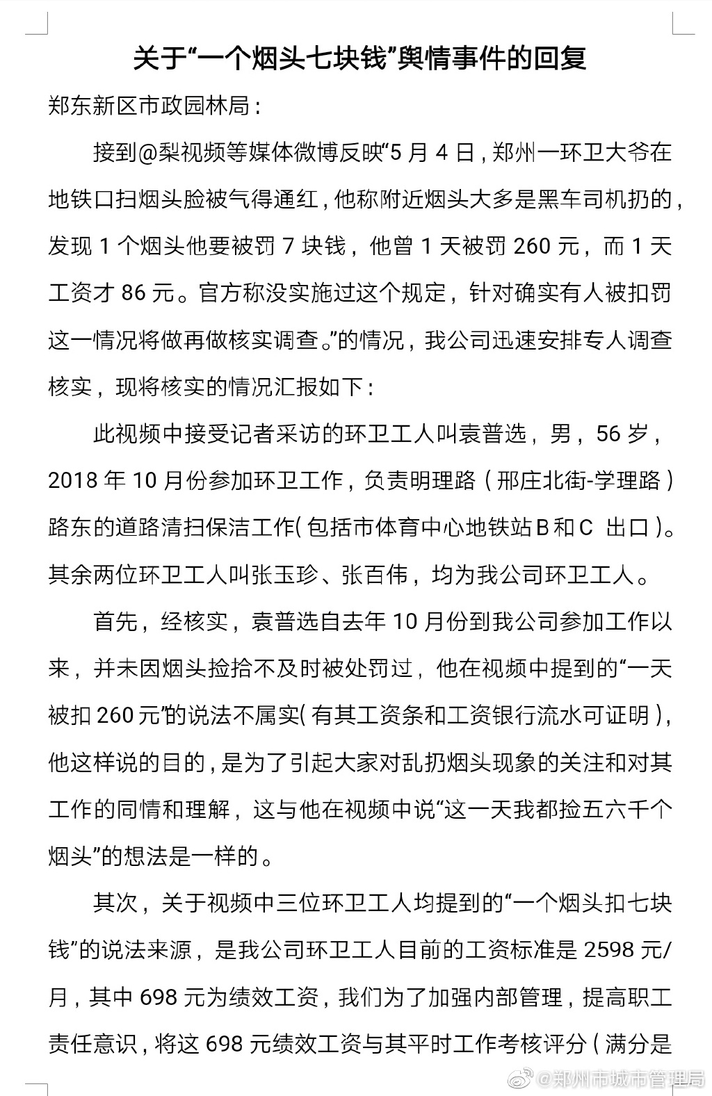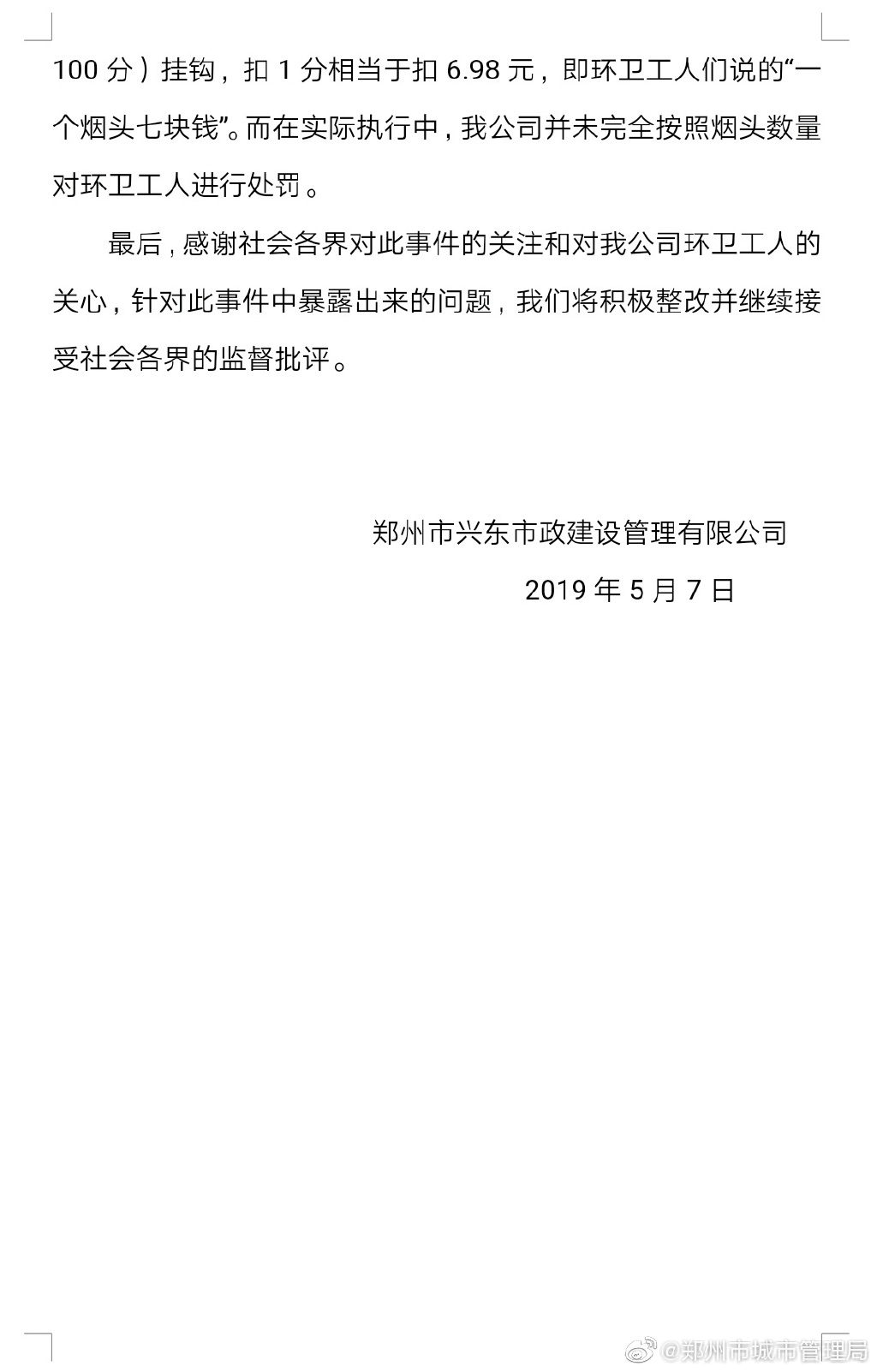 據鄭州市城市管理局官方微博消息,5月7日,鄭州市興東市政建設管理有限公司針對網友近期特別關注的“發現一個煙頭扣環衛工人七塊錢"的輿情事件的調查回復(見附圖)。
