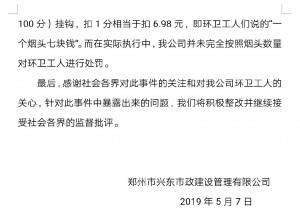 5月8日,鄭州市城市管理局官方微博發布對于該公司的回復,鄭州市城市管理局環衛處薛芳禮處長指出鄭州市目前執行的環衛職工工資標準2598元/月里面,按規定只能有450元作為績效工資,且最低發放數額不能少于300元,即扣除部分最多不能超過150元。而該公司將其中698元作為績效工資屬于違規行為,已責令鄭東新區市政園林局督促該公司馬上整改,并安排各區環衛主管部門核查自己轄區是否存在類似違規情況。