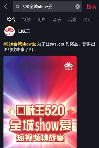 5月20日當天,記者登錄抖音平臺時發現,在口味王擁有35.7萬粉絲的官方賬號下,一條題為“口味王520全城show愛”短視頻挑戰賽的短視頻被置頂。