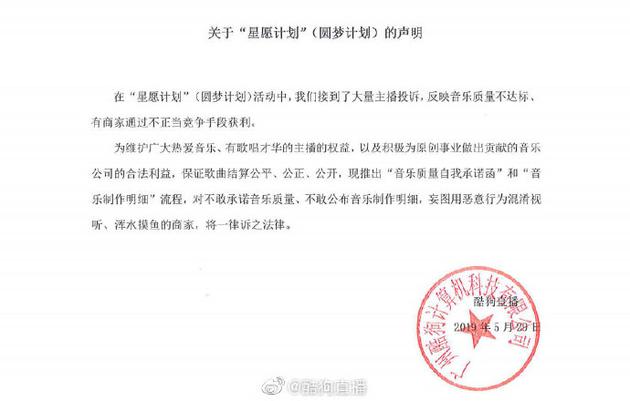 酷狗直播表示,在“星愿計劃”(圓夢計劃)活動中,接到了大量主播投訴,反映音樂質量不達標,有商家通過不正當競爭手段獲利。