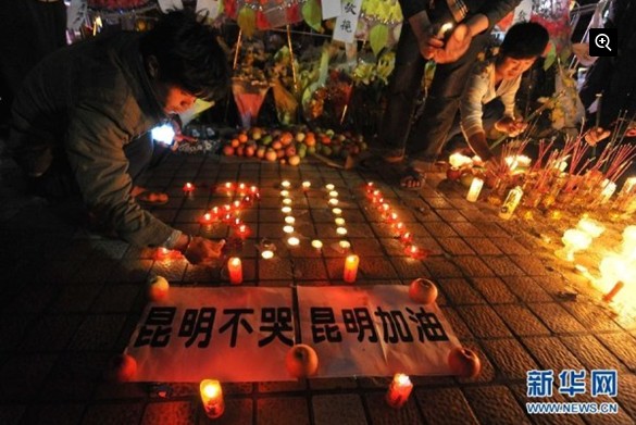 2014年3月3日晚,群眾在昆明火車站的站前廣場上點燃蠟燭,悼念暴力恐怖案中的遇難者。記者從公安部獲悉,3月1日晚發(fā)生在云南昆明火車站的嚴重暴力恐怖案,經(jīng)公安部組織云南、新疆、鐵路等公安機關和其他政法力量40余小時的調(diào)查,已于3月3日下午告破。現(xiàn)已查明,該案是以阿不都熱依木·庫爾班為首的暴力恐怖團伙所為。該團伙共有8人(6男2女),現(xiàn)場被公安機關擊斃4名、擊傷抓獲1名(女),其余3名已落網(wǎng)。