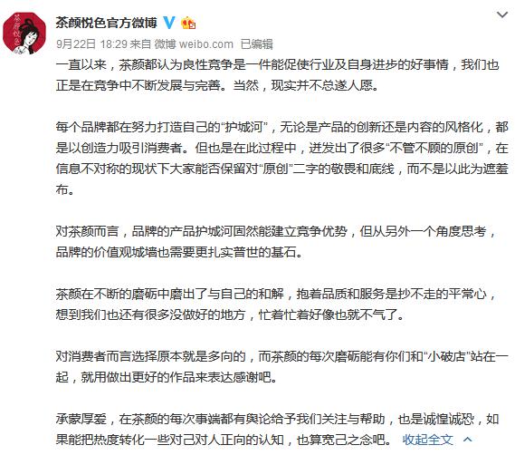 22日晚,茶顏悅色微博發(fā)文疑似回應(yīng)“抄襲事件”。