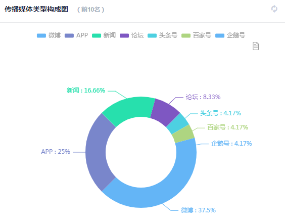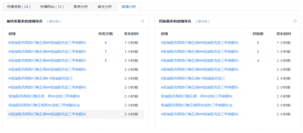 微博所占比例最高,主要是微博話題#恒瑞醫(yī)藥再陷行賄丑聞##恒瑞醫(yī)藥送三甲麻醉科主任140萬#引關(guān)注。微博用戶@全景網(wǎng)發(fā)布的【#恒瑞醫(yī)藥再陷行賄丑聞# #恒瑞醫(yī)藥送三甲麻醉科主任140萬#】