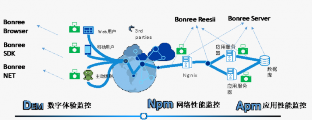 NPM:網絡性能管理, 通過網絡探針、 BigIP大數據引擎、Nginx Telemetry等技術, 實現網絡傳輸的全路徑監控。