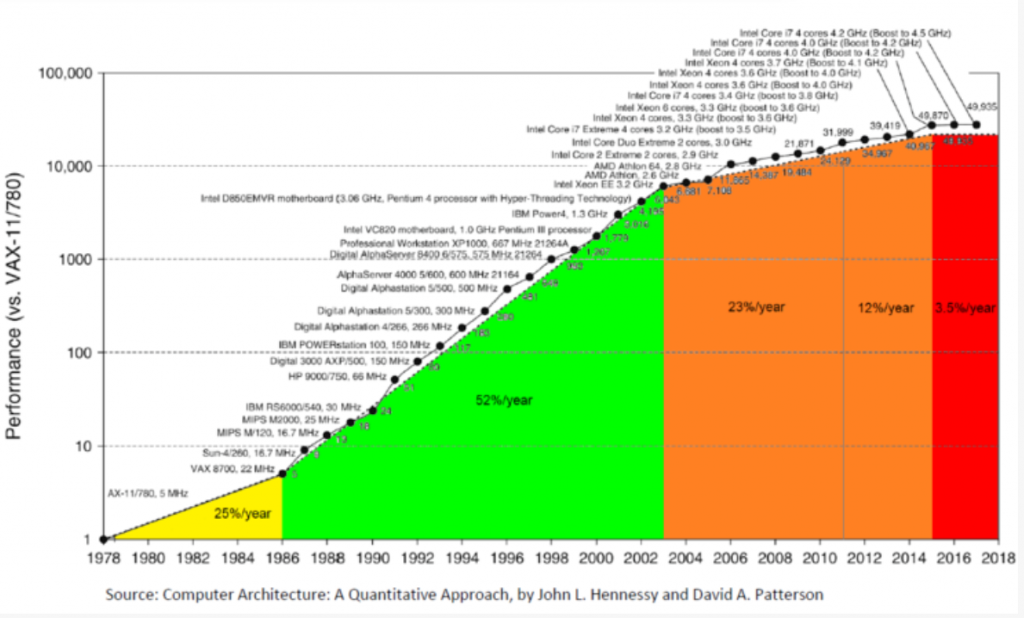自2015年開始,芯片性能的提升越來越難,摩爾定律放緩的6年時間,先進工藝制程的焦點成了臺積電和三星,提出摩爾定律的英特爾數次延期10nm量產時間。在CPU市場,AMD也發起猛烈攻勢,英偉達憑借GPU成為了最炙手可熱的AI公司,市值超越英特爾。