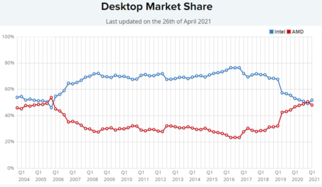 Zen架構歷經三代迭代,AMD的CPU性能迅速接近和趕超在很長一段時間領先的英特爾。AMD CPU性能的大增也帶來了市場份額的增長,根據Passmark評測網站的數據,AMD在桌面市場去年九月份的市場份額達到了48%,短暫超過英特爾,AMD上一次在桌面市場份額超過英特爾還是2006年。