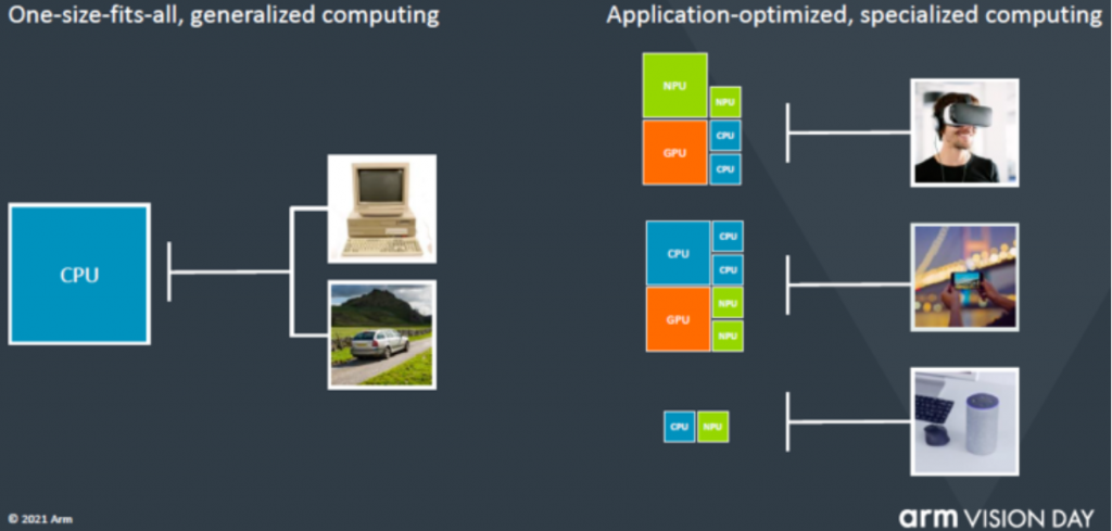 芯片巨頭們也用最新的產品路線圖證明了芯片競爭開啟了新賽場。ARM在四月初發布最新一代架構ARMV9時就強調全面計算的理念,也就是通過CPU、GPU、NPU的組合,滿足汽車、基礎設施、物聯網等應用的需求。